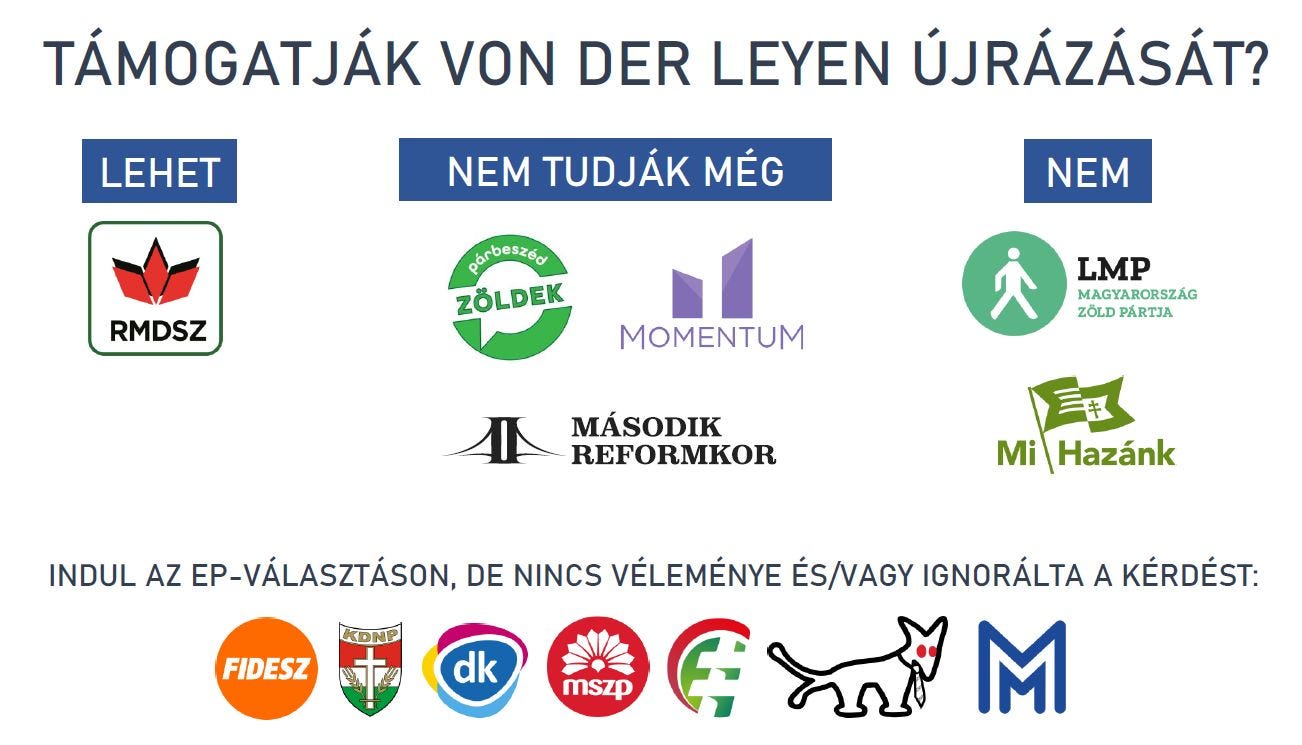 Második Reformkor: Egyelőre nem tudunk felelősségteljes választ adni, erre a kérdésre, hiszen jelenleg nem vagyunk tagjai egyik európai pártcsaládnak sem, és még a csúcsjelöltek programjai sem kristályosodtak ki. A jelenlegi bizottsági elnök alternatívájaként a szociáldemokraták Nicolas Schmitet szánják, de sem az ő, sem von der Leyen pontos, következő 5 évre vonatkozó céljait nem ismerjük. Ezen információk birtokában szeretnénk majd erről állást foglalni.
