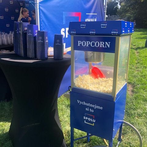 A közönség nagyjából fele a Spolu prágai jelöltjeiből és családtagjaiból áll. Ezt két dologból tudni. Az egyik, hogy ők vettek fel az utónyári melegben is öltönyt-nyakkendőt, a másik, hogy folyamatosan cserélődik, kikkel beszélgetnek, tízméterenként megállnak egy kézfogásra, vállveregetésre. Miközben egy Orbán-beszéd alatt az ájult figyelem az elvárt magatartás, itt láthatóan az az alapállás, hogy a miniszterelnök beszéde alatt is mehet a susmus – a kormánypalotában a nap folyamán Olaf Scholz német kancellárt fogadó Petr Fiala az állandóságot és az elvhűséget jelképezi, senki sem várja azt, hogy augusztus 29-én, a Moldva melletti parkban jelentsen be valami váratlant és szokatlant. Nagy tapsok sincsenek, semmi színpadias gesztus: itt alapvetően emberek összejöttek inni egy sört a parkban, hogy seregszemlét tartsanak leginkább egymás számára. Aki pedig csak kijött, mert látta az eseményt a Facebookon, kapott ingyen popcornt, kitűzőt, lufit, a gyerekének pedig volt ugrálóvár, arcfestés, tetoválás, rögtönzött játszótér. Boldog békeidők.