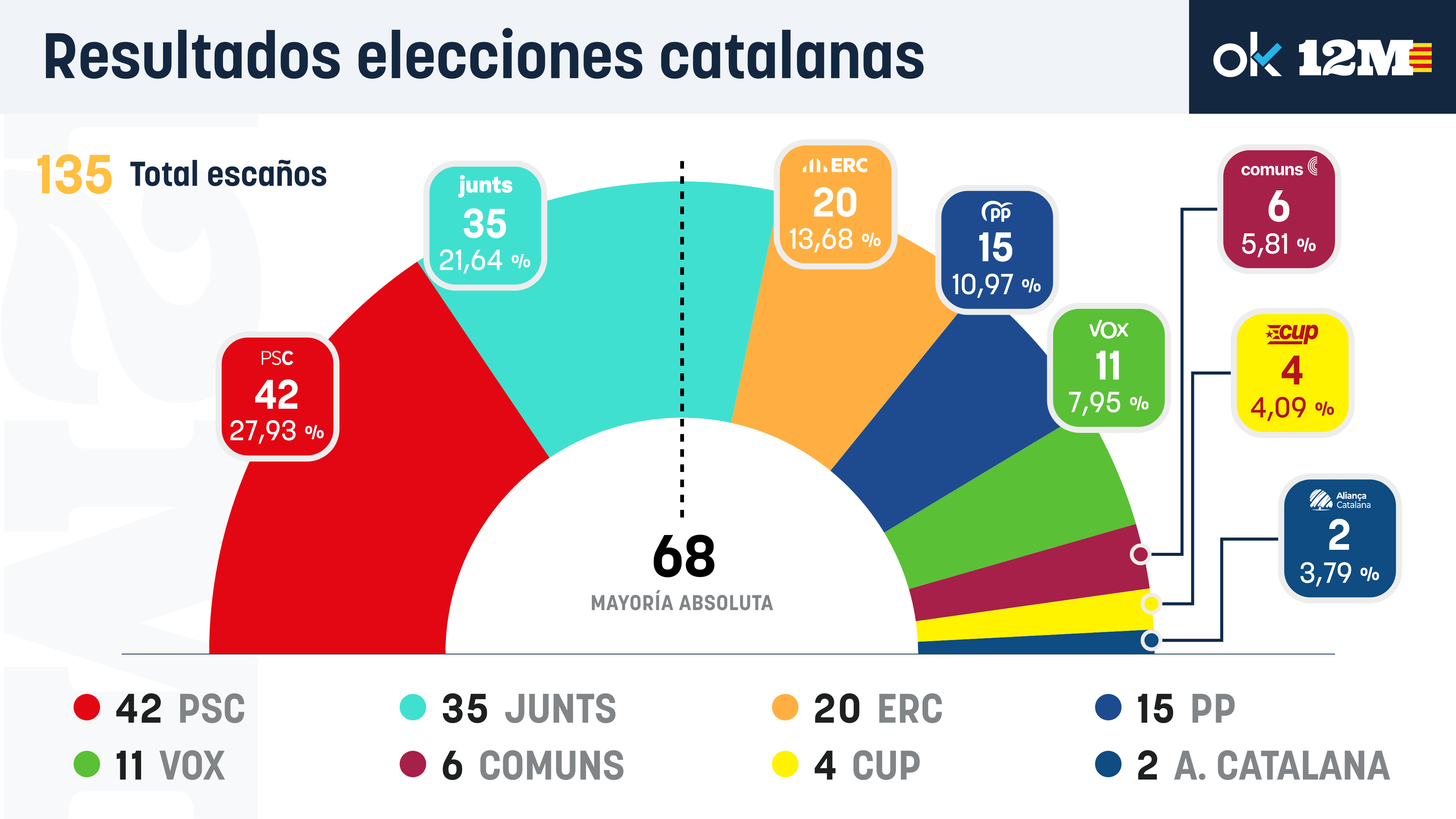 Mindezek fényében az új tartományi miniszterelnök megválasztásához szükséges egyszerű többség csak egyetlen kombinációban, egy ún. progresszív koalícióban hozható össze: ha a győztes PSC 42 mandátumához hozzáadjuk az ERC 20 és a Comuns Sumar 6 darab képviselőjét.