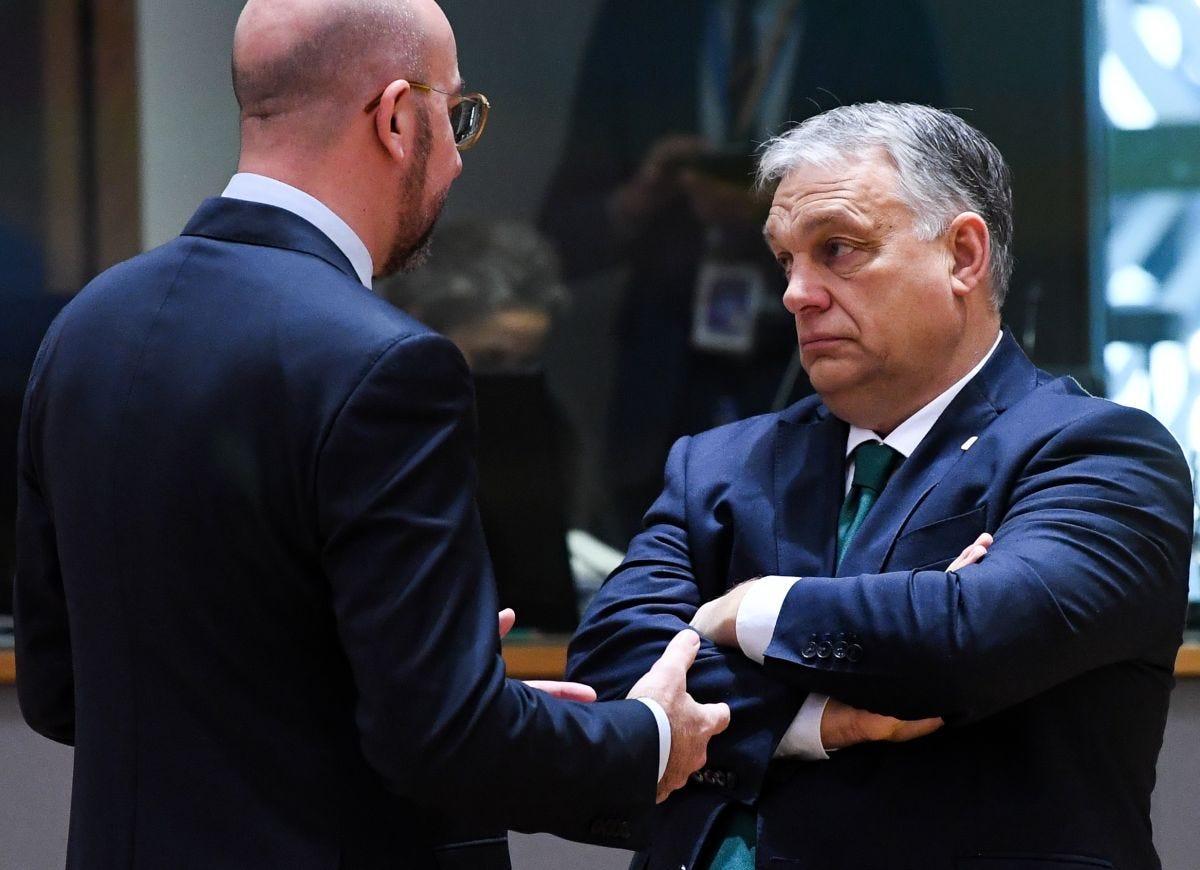 Orbán Viktor a tagállami kormányokat tömörítő Európai Tanács elnökével, Charles Michellel idén márciusban. Fotó: Európai Tanács sajtószolgálata