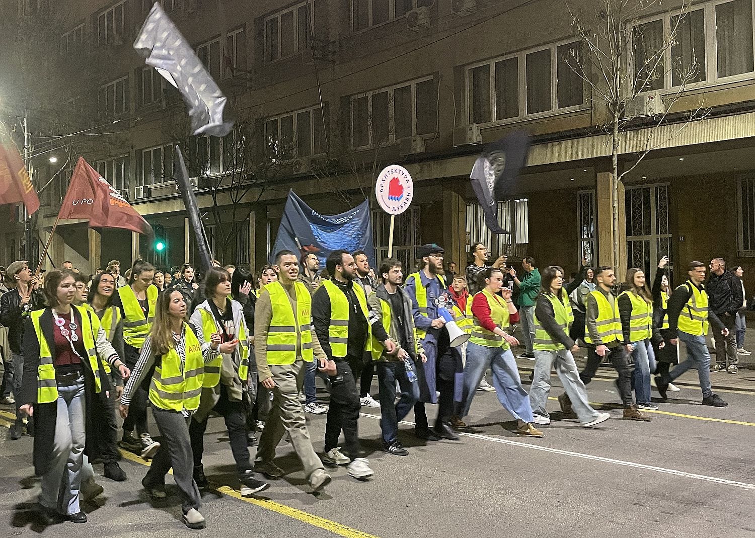 A nemzetközi sajtó egybites nyugatos-oroszpárti narratíváiba belebutult szemeknek furcsa lehet, hogy nincsenek EU-zászlók a szerbiai ellenzéki tüntetéseken, és az egyetemisták se nagyon akarnak ilyesmiket látni ott. A követeléseikről – az újvidéki pályaudvar felújításának teljes dokumentációjának nyilvánosságra hozatala, a hallgatókra támadók elleni bűnvádi eljárás megindítása, a letartóztatott egyetemisták elleni eljárások beszüntetése, a felsőoktatás büdzséjének 20%-kal történő megemelése – rögtön a nagy blokád első napján döntöttek a belgrádi tanszékek közös plénumán. Ezek nem feltétlenül aktuálpolitikai témák, noha nyilván tisztában vannak vele, hogy minden politika – de szándékosan nem mennek bele ennél jobban.