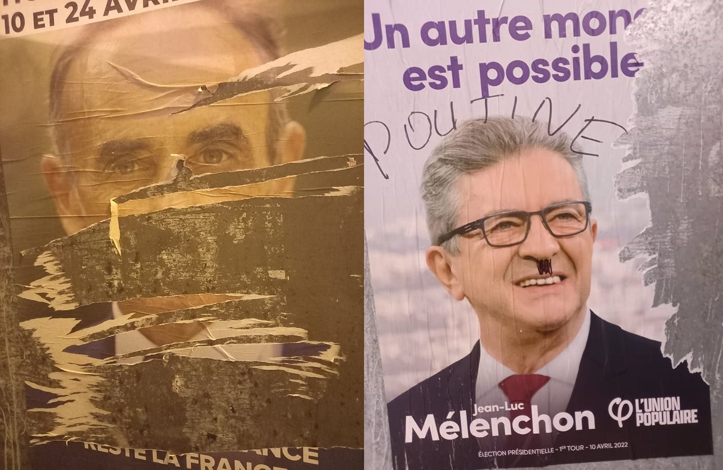 Ha ez bármit is mutat a hangulatról (nem), akkor: Zemmour plakátjai felismerhetetlenségig letépve; Marine Le Pen azért még megismerhető, de ő is meg van mindenütt rendesen tépve; Macron hitlerbajusszal vagy összekarcolva (de nekik elég erős ragasztójuk lehet); a nacionálkommunista Jean-Luc Mélenchon plakátjai „Putyin“, „putyinista“ szavakkal vannak telifirkálva.